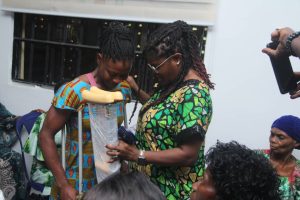 Items distributed included bags of rice, cartons of Mimee Indomie noodles, gallons of groundnut oil, Maggi seasoning cubes, several crutches, and significant cash donations.